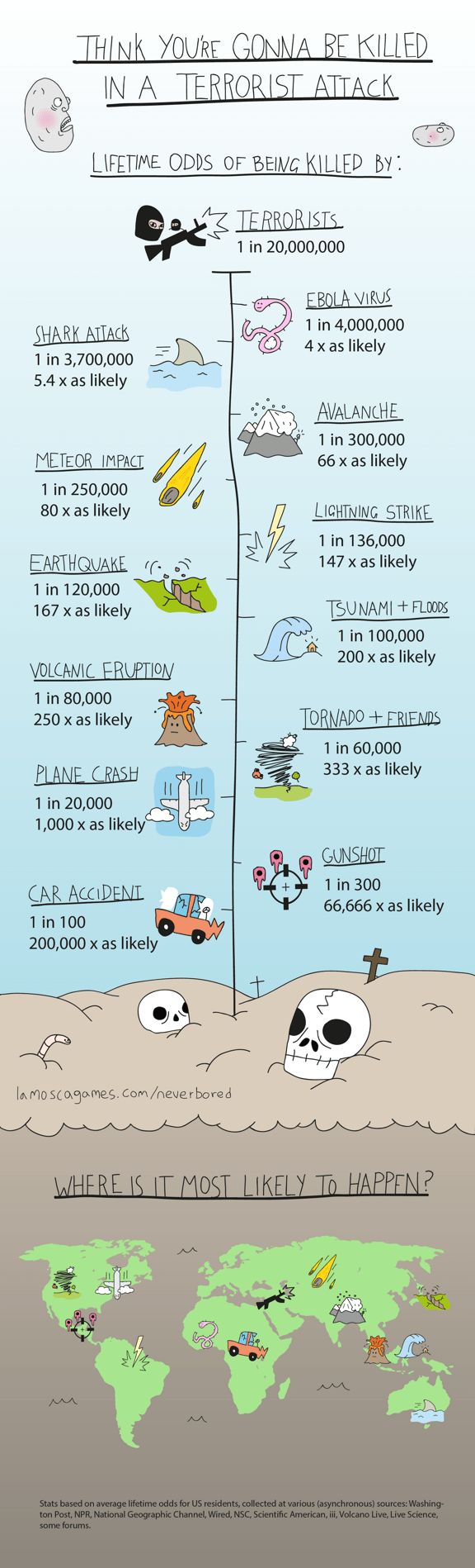 The chances that you are going to be killed in the next ’terror attack’ are much smaller than the chances that you are getting killed by a drunk driver, by crossing a road, by actually driving a car and for some reason, in the USA, by having your toddler grab your gun from your purse.